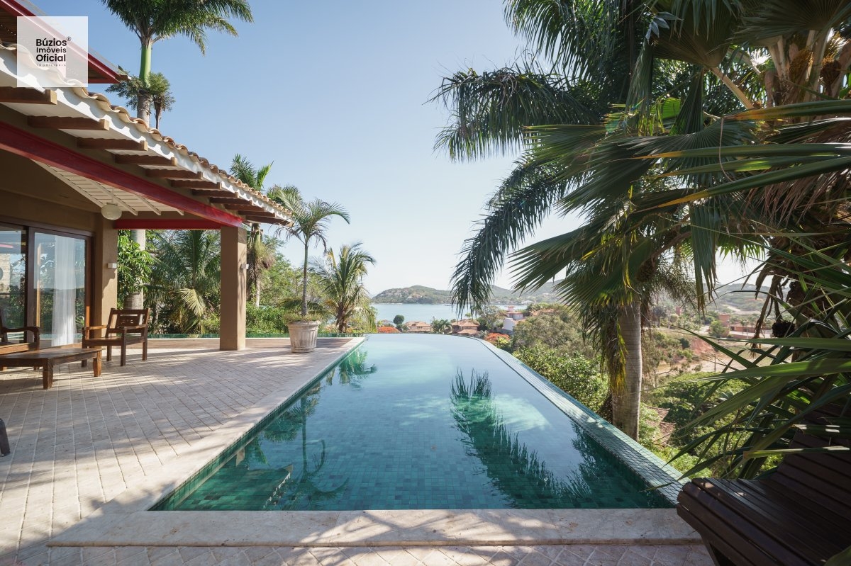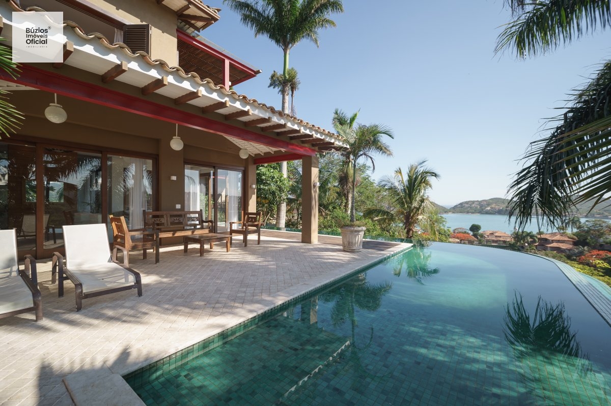 Térreo: sala 3 ambientes, 2 suítes, cozinha, lavabo, área de serviço, espaço gourmet com churrasqueira, varanda com deck, DCE,piscina em raia com borda infinita e com vista para praia de Ferradura.