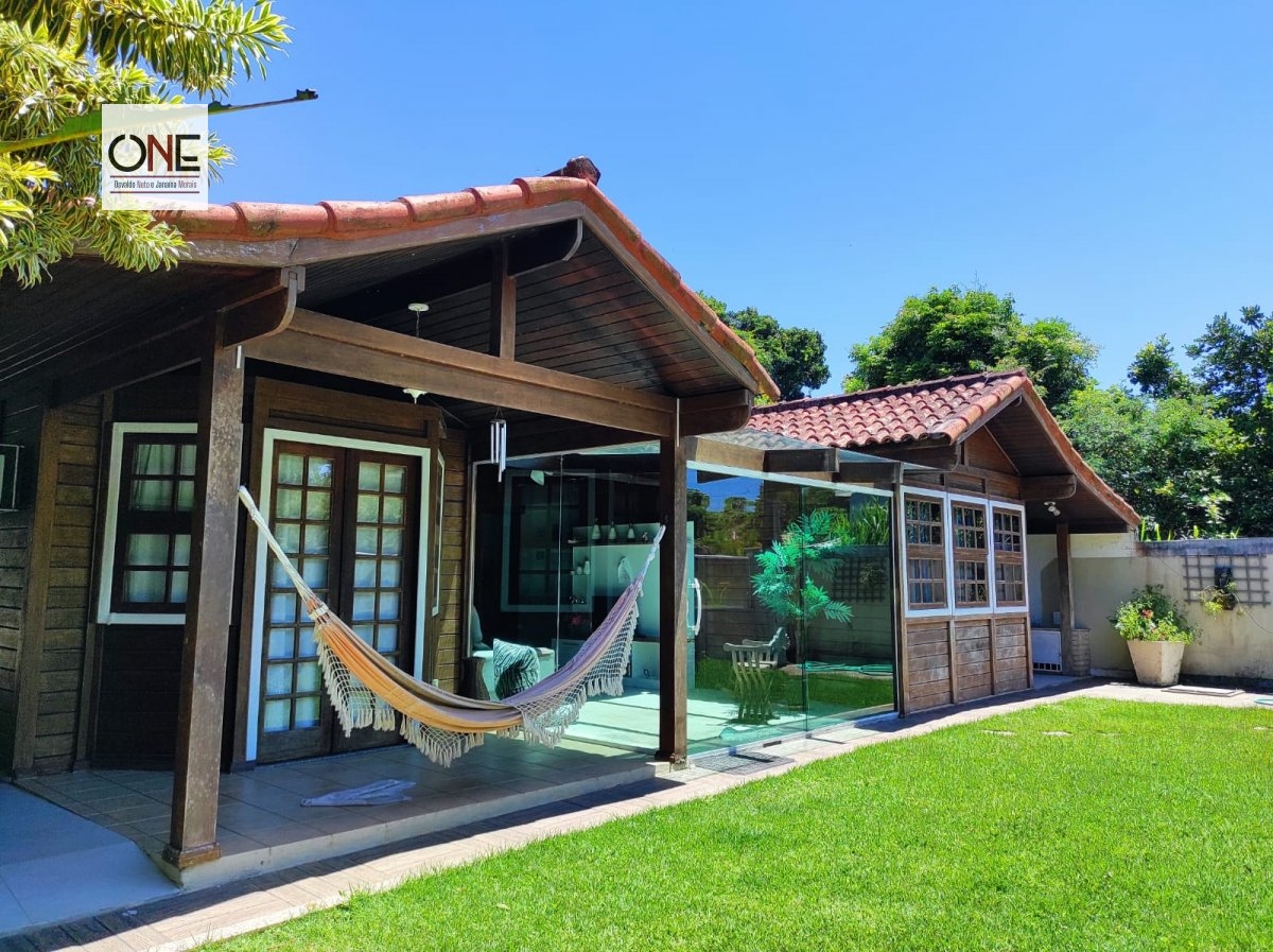 Parte madeira e parte alvenaria, 2 suítes sendo 1 suíte com porta de acesso ao jardim, sala em dois ambientes, lavabo, cozinha integrada estilo americana, com armários planejados, área de serviço e varanda.